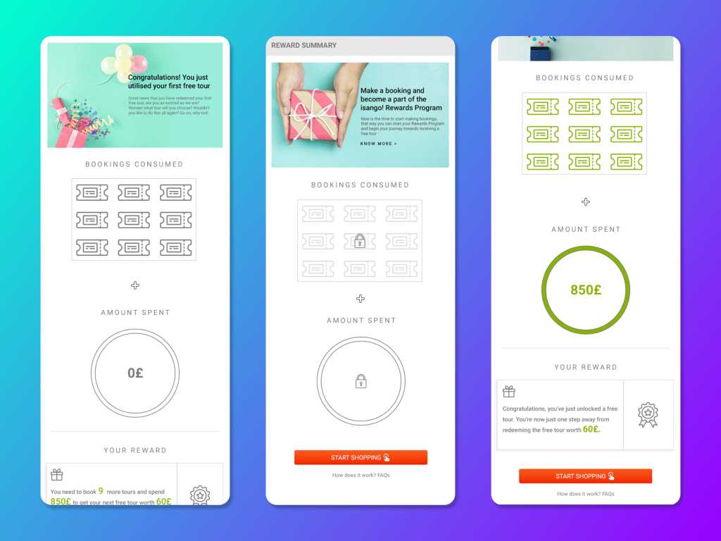 The aim of isango!’s Loyalty Program was to incentivize customers to revisit the website and make further purchases. The program was designed to provide users with a gamified rewarding scheme.