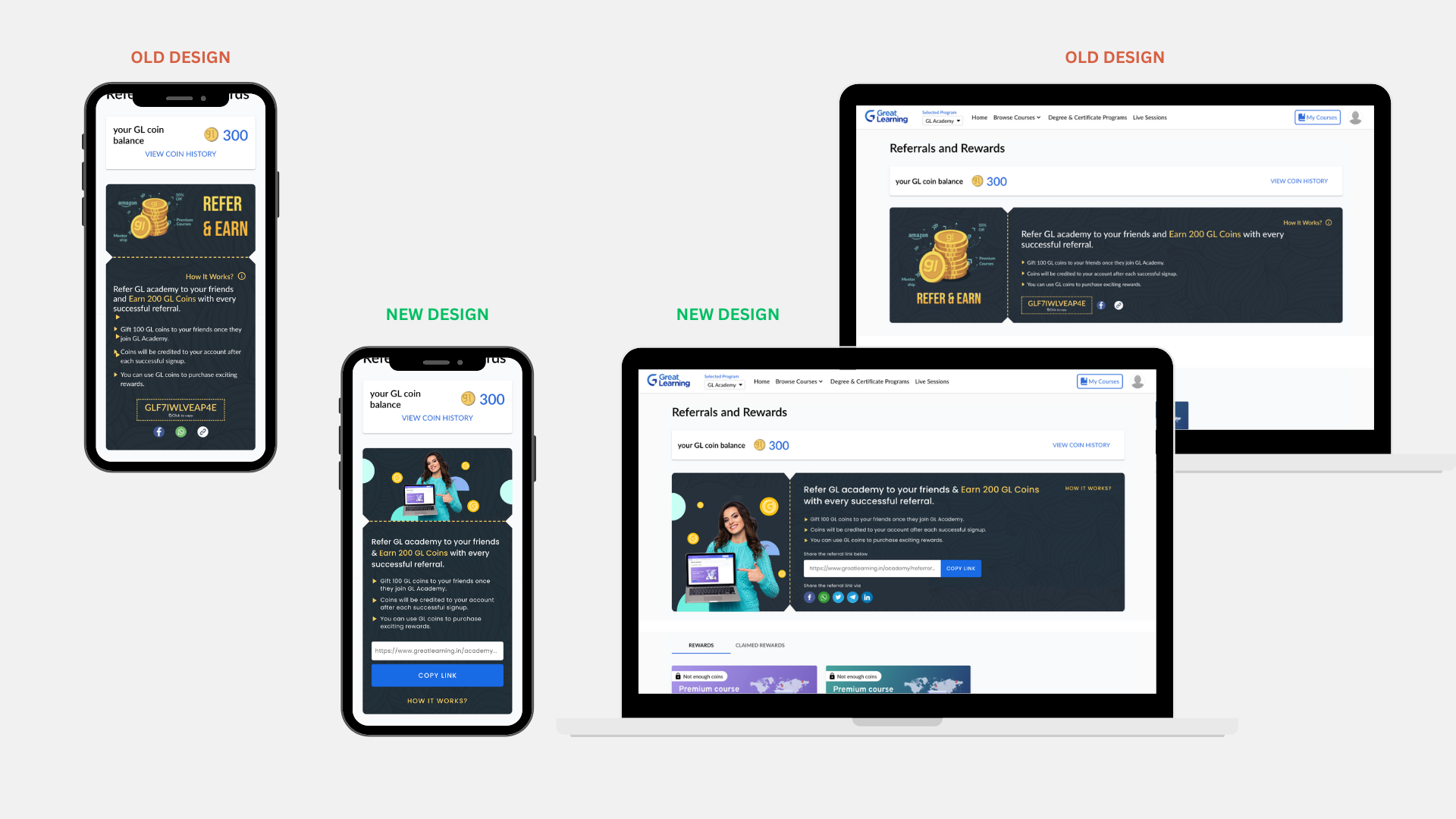 As part of my work with the product and design team at GLA, I was tasked with redesigning the Referrals and Rewards program to improve user engagement and increase the utilization of the referral feature. The goal of the project was to identify user pain points and emotions while interacting with the existing interface, and to create a more user-friendly design that would encourage users to refer new users to the platform.