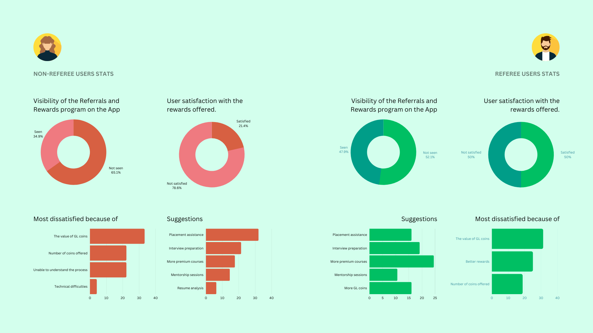 The majority of users are dissatisfied with the rewards offered in GLA’s referral program. One hypothesis could be that the information regarding premium courses is not highlighted well, making it difficult for users to measure their true value. However, I recommended keeping premium courses as part of our reward system as they are valuable for users who want to opt for something low-budget.